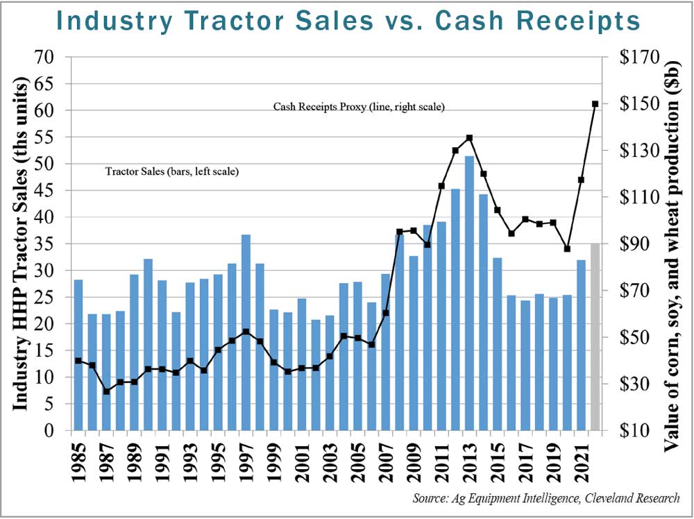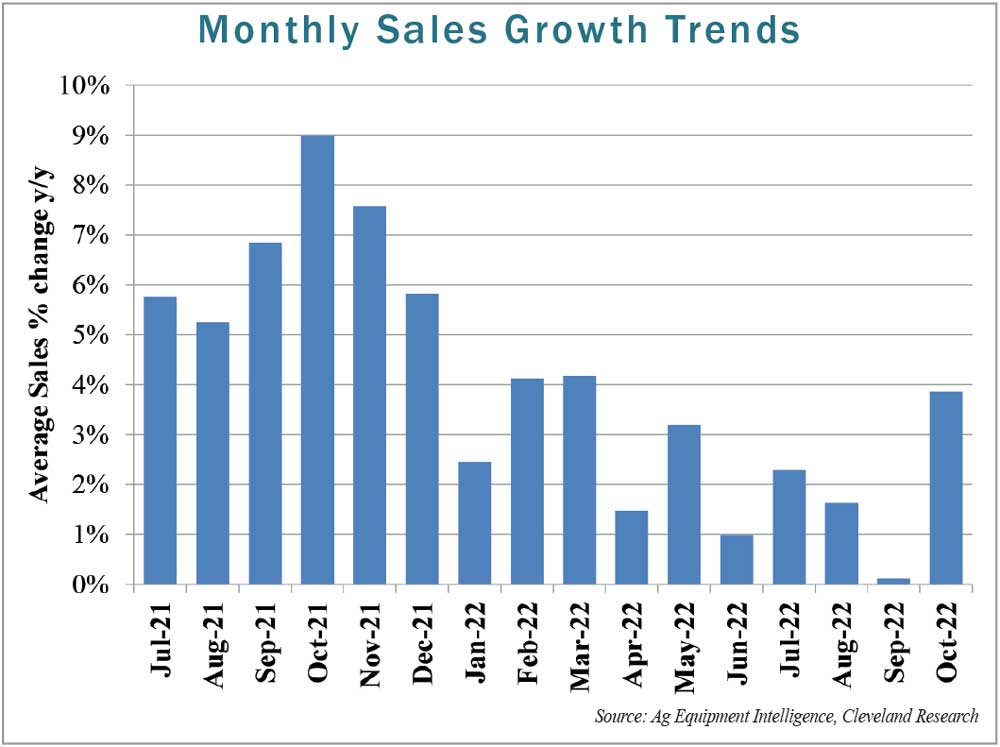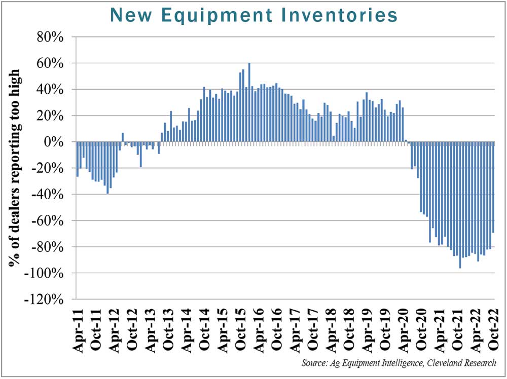 This information was licensed with permission from a 26-page monthly report prepared by Ag Equipment Intelligence and Cleveland Research Co. The full report, and its 52 tables/charts, is prepared monthly from a survey of North American dealers and distributed to the paid subscribers of Ag Equipment Intelligence. It includes narrative/analysis and examines 12 key product categories as well as pricing in new/used equipment, new/used equipment inventories, commodity price trends, supply/demand projections, planted acreage data and machinery sales histories. To subscribe, visit www.agequipmentintelligence.com PROMO CODE: FE-1